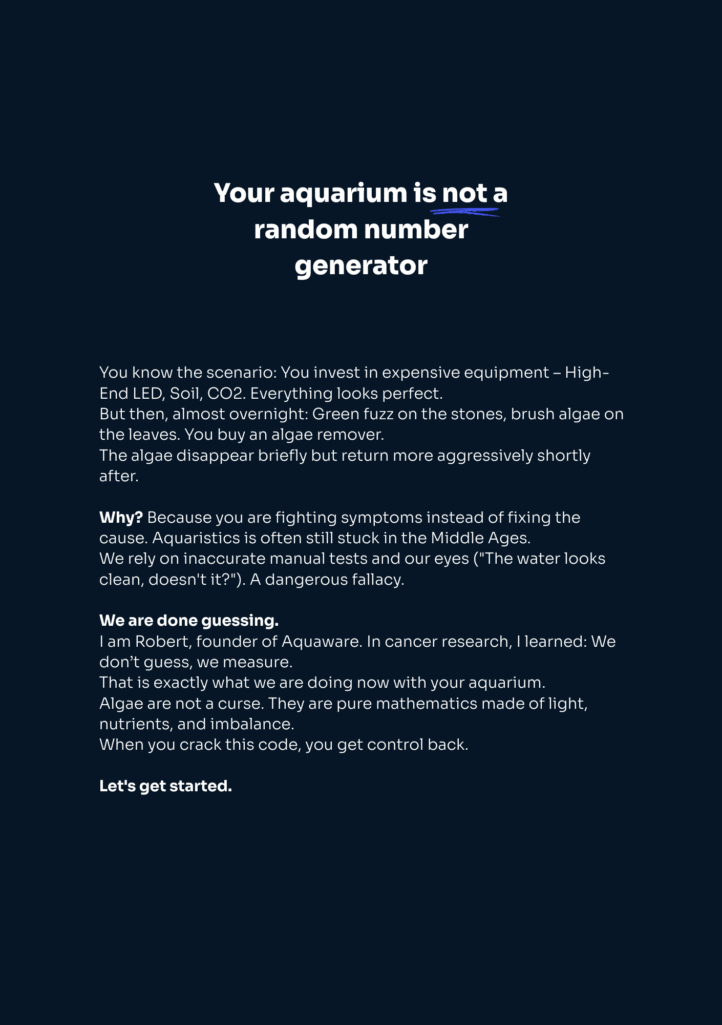 Across 24 intense pages, you won’t find vague advice, but step-by-step protocols for every major algae type. Whether it’s BBA, Cyanobacteria, or Green Water – we show you exactly which parameter (Light, CO2, Nitrate, Iron) is off-balance and how to fix it with precision.